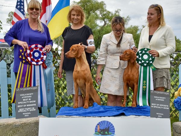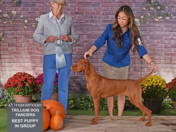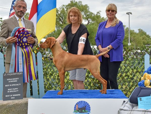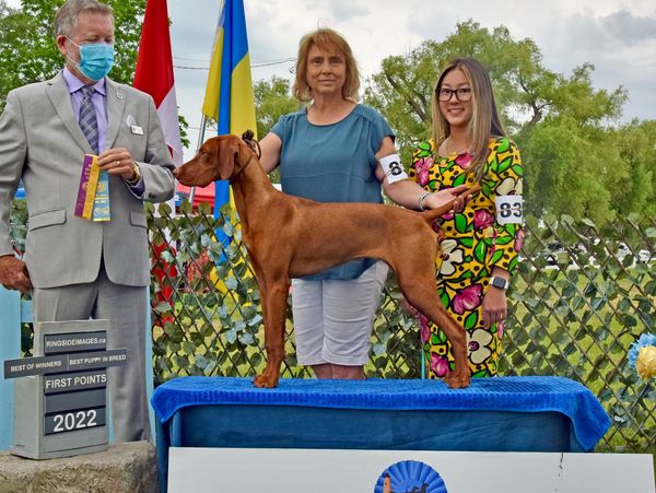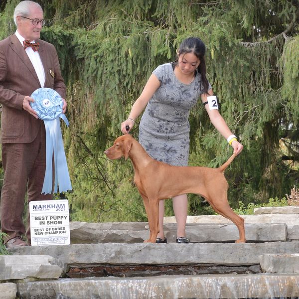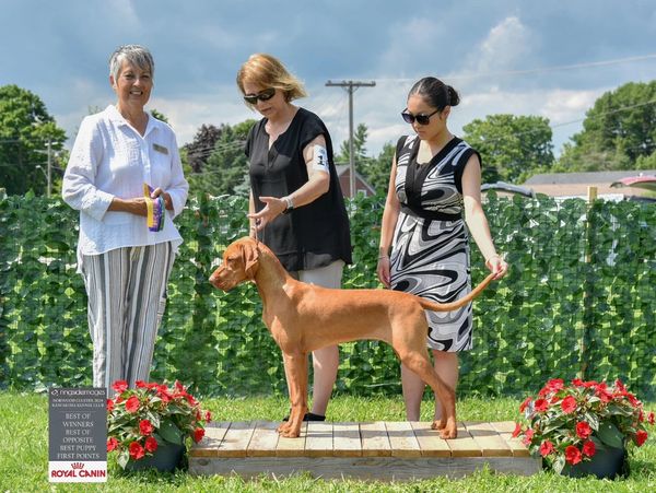 Juniper Rose wins Best of Opposite & Best Puppy at the Vizsla Society of Ontario Booster at the Caledon Kennel Club Show.